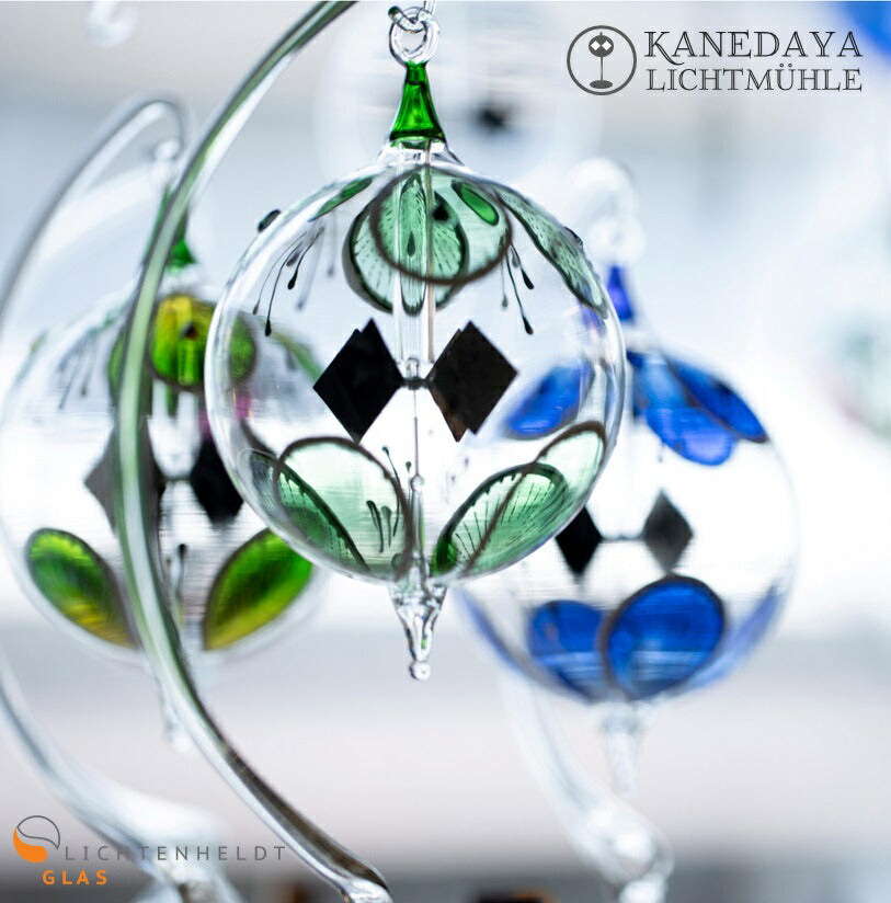 回転のスピードは、ヒカリの種類や強さによって変化します。LED、蛍光灯、遮熱処理が施されたガラス窓からの太陽光では回らないことがあります。手作りであるため、大きさや形、色合い、気泡の入り方、回転の速さなどに個体差があります。作業工程ではガラスに気泡や小さな窯傷やザラつきが入ることがあります。また、羽を黒くするために付けられた煤(すす)が剥がれ落ちたり、塵(ちり)となってガラスの内側に付着することがあります。日常的に高速回転が続く環境下で使用すると回転しなくなることがあります。これらの現象は不良ではなく、製品それぞれの個性や特性としてご理解ください。