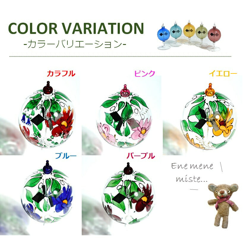 回転のスピードは、ヒカリの種類や強さによって変化します。LED、蛍光灯、遮熱処理が施されたガラス窓からの太陽光では回らないことがあります。手作りであるため、大きさや形、色合い、気泡の入り方、回転の速さなどに個体差があります。作業工程ではガラスに気泡や小さな窯傷やザラつきが入ることがあります。また、羽を黒くするために付けられた煤(すす)が剥がれ落ちたり、塵(ちり)となってガラスの内側に付着することがあります。日常的に高速回転が続く環境下で使用すると回転しなくなることがあります。これらの現象は不良ではなく、製品それぞれの個性や特性としてご理解ください。