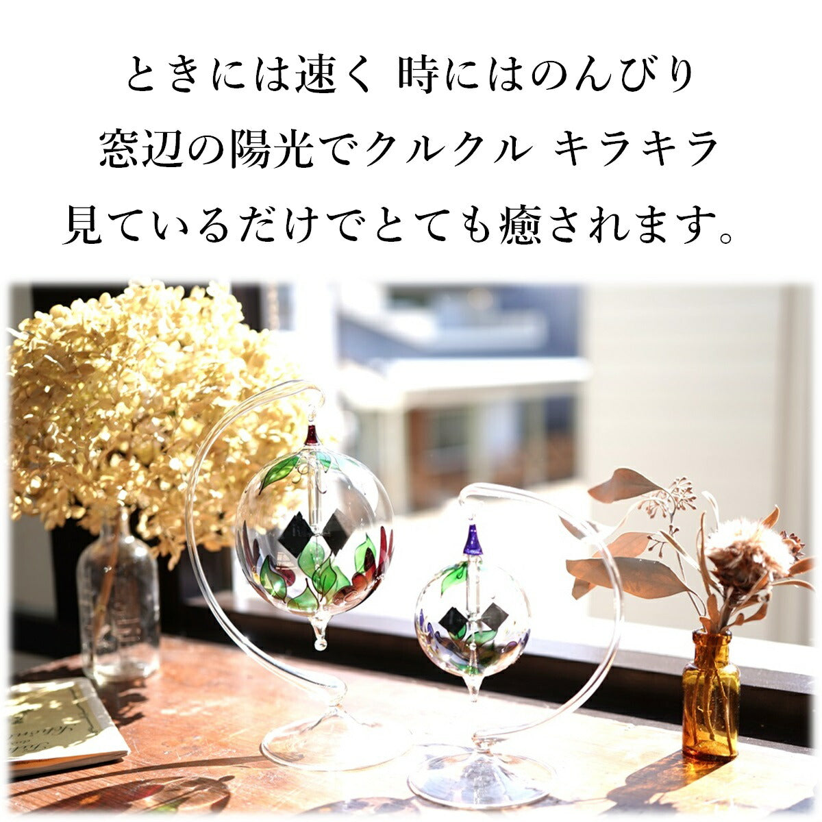 回転のスピードは、ヒカリの種類や強さによって変化します。LED、蛍光灯、遮熱処理が施されたガラス窓からの太陽光では回らないことがあります。手作りであるため、大きさや形、色合い、気泡の入り方、回転の速さなどに個体差があります。作業工程ではガラスに気泡や小さな窯傷やザラつきが入ることがあります。また、羽を黒くするために付けられた煤(すす)が剥がれ落ちたり、塵(ちり)となってガラスの内側に付着することがあります。日常的に高速回転が続く環境下で使用すると回転しなくなることがあります。これらの現象は不良ではなく、製品それぞれの個性や特性としてご理解ください。