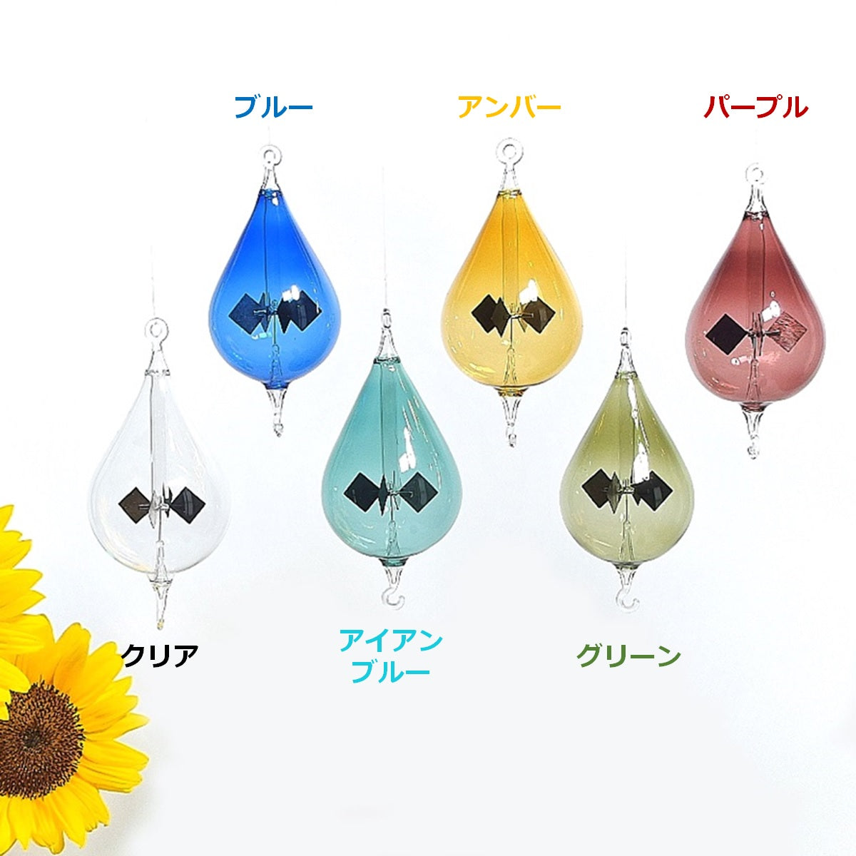 回転のスピードは、ヒカリの種類や強さによって変化します。LED、蛍光灯、遮熱処理が施されたガラス窓からの太陽光では回らないことがあります。手作りであるため、大きさや形、色合い、気泡の入り方、回転の速さなどに個体差があります。作業工程ではガラスに気泡や小さな窯傷やザラつきが入ることがあります。また、羽を黒くするために付けられた煤(すす)が剥がれ落ちたり、塵(ちり)となってガラスの内側に付着することがあります。日常的に高速回転が続く環境下で使用すると回転しなくなることがあります。これらの現象は不良ではなく、製品それぞれの個性や特性としてご理解ください。