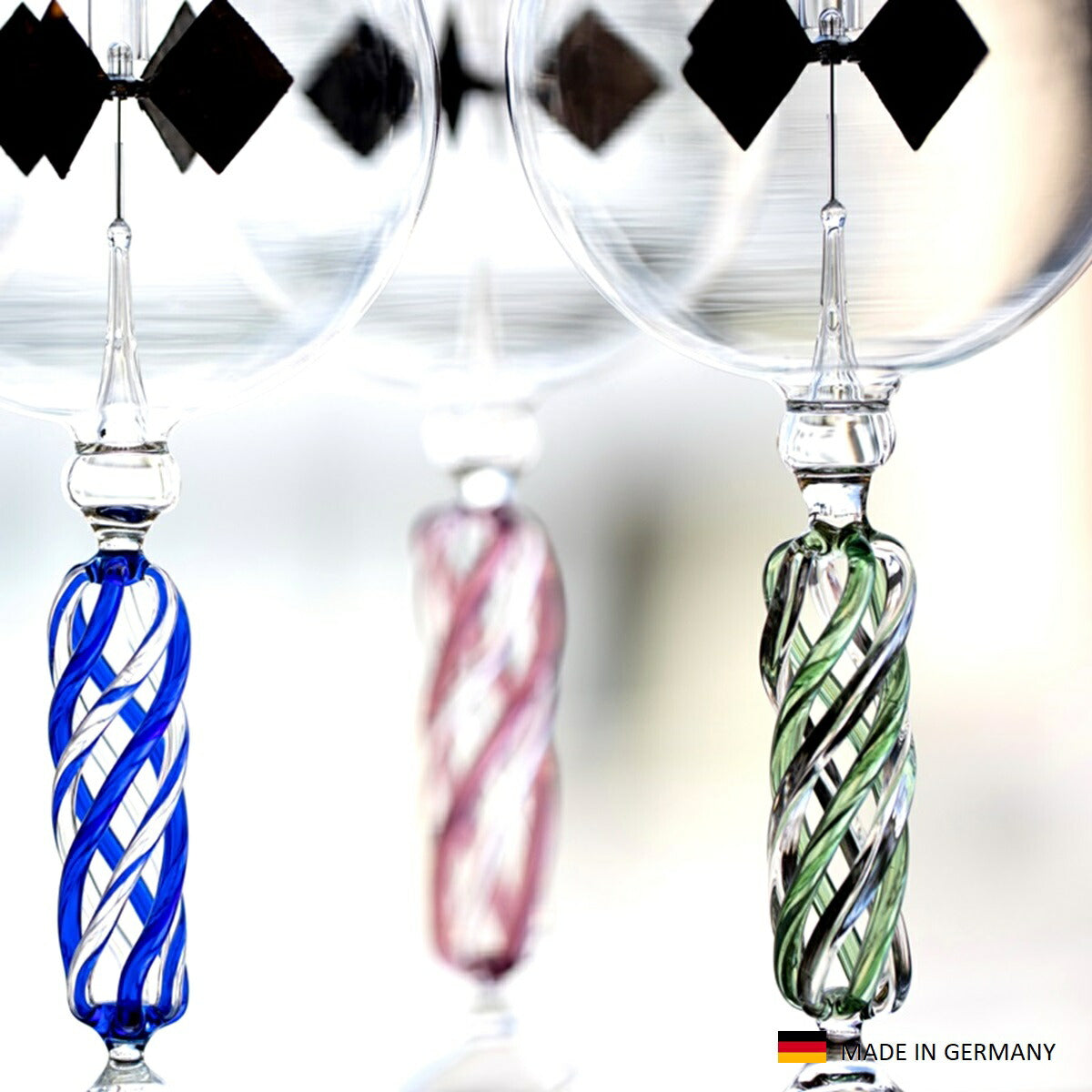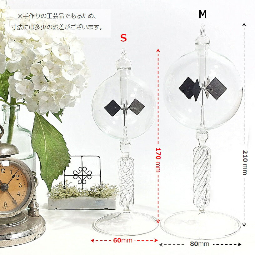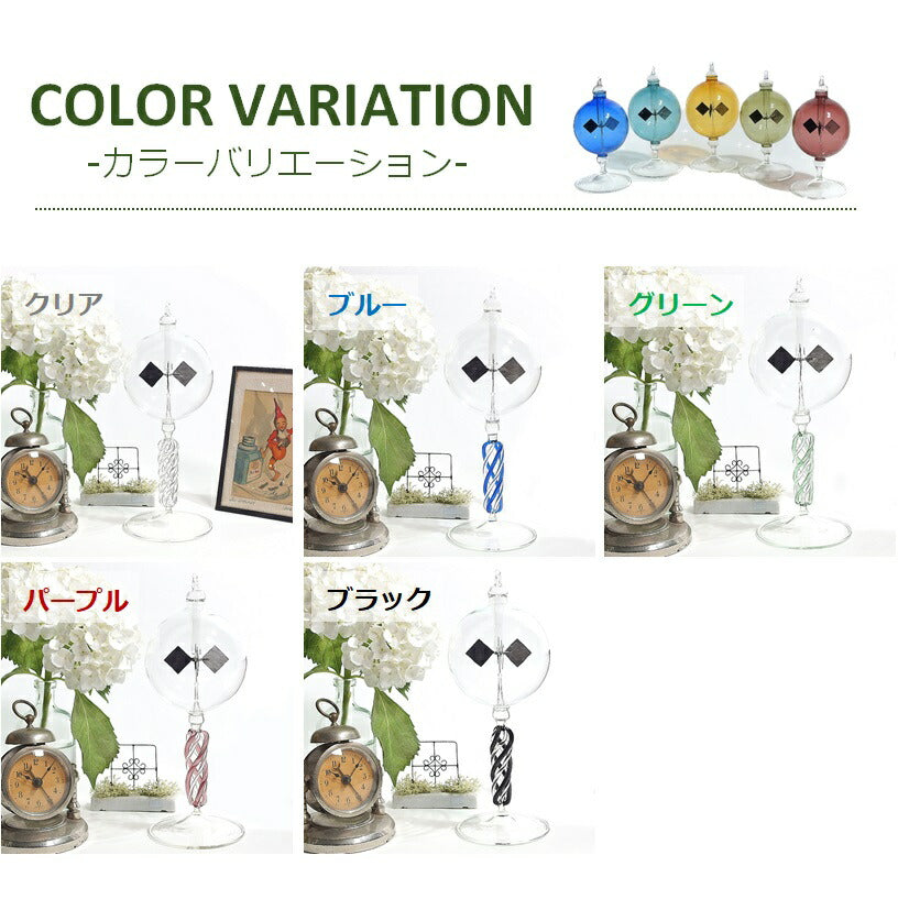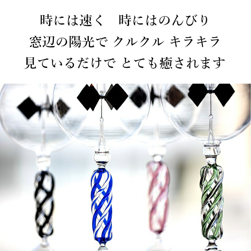 回転のスピードは、ヒカリの種類や強さによって変化します。LED、蛍光灯、遮熱処理が施されたガラス窓からの太陽光では回らないことがあります。手作りであるため、大きさや形、色合い、気泡の入り方、回転の速さなどに個体差があります。作業工程ではガラスに気泡や小さな窯傷やザラつきが入ることがあります。また、羽を黒くするために付けられた煤(すす)が剥がれ落ちたり、塵(ちり)となってガラスの内側に付着することがあります。日常的に高速回転が続く環境下で使用すると回転しなくなることがあります。これらの現象は不良ではなく、製品それぞれの個性や特性としてご理解ください。