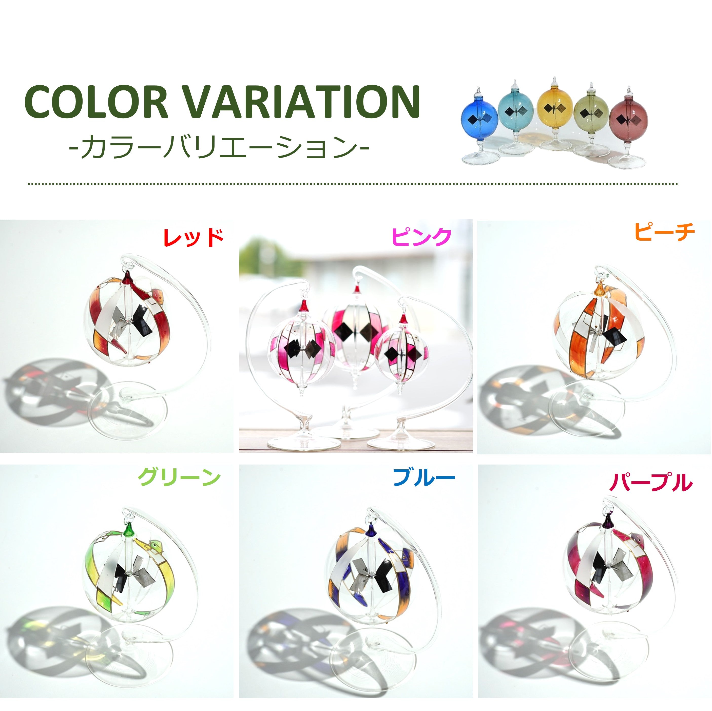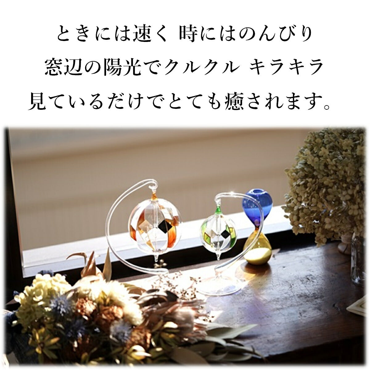 回転のスピードは、ヒカリの種類や強さによって変化します。LED、蛍光灯、遮熱処理が施されたガラス窓からの太陽光では回らないことがあります。手作りであるため、大きさや形、色合い、気泡の入り方、回転の速さなどに個体差があります。作業工程ではガラスに気泡や小さな窯傷やザラつきが入ることがあります。また、羽を黒くするために付けられた煤(すす)が剥がれ落ちたり、塵(ちり)となってガラスの内側に付着することがあります。日常的に高速回転が続く環境下で使用すると回転しなくなることがあります。これらの現象は不良ではなく、製品それぞれの個性や特性としてご理解ください。