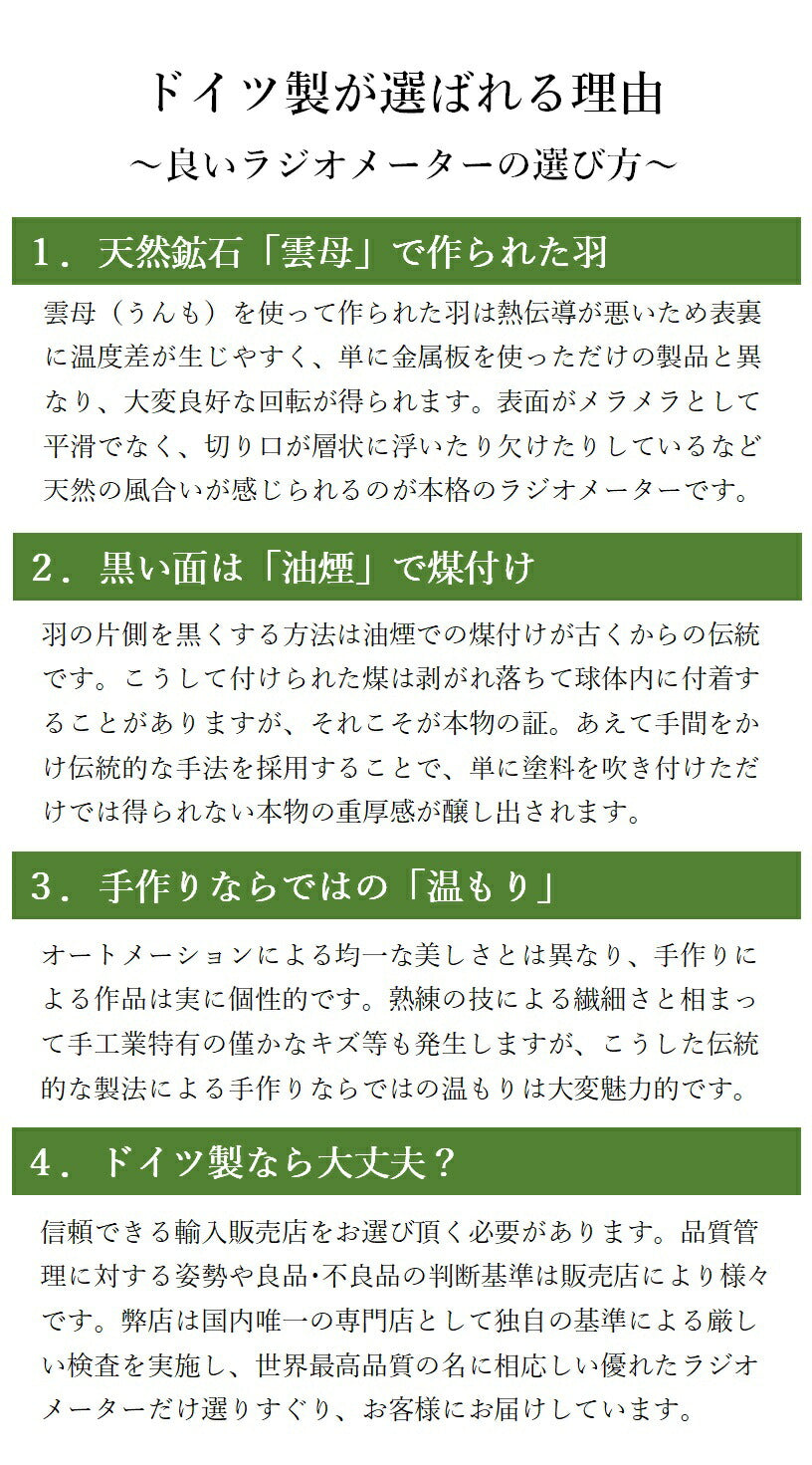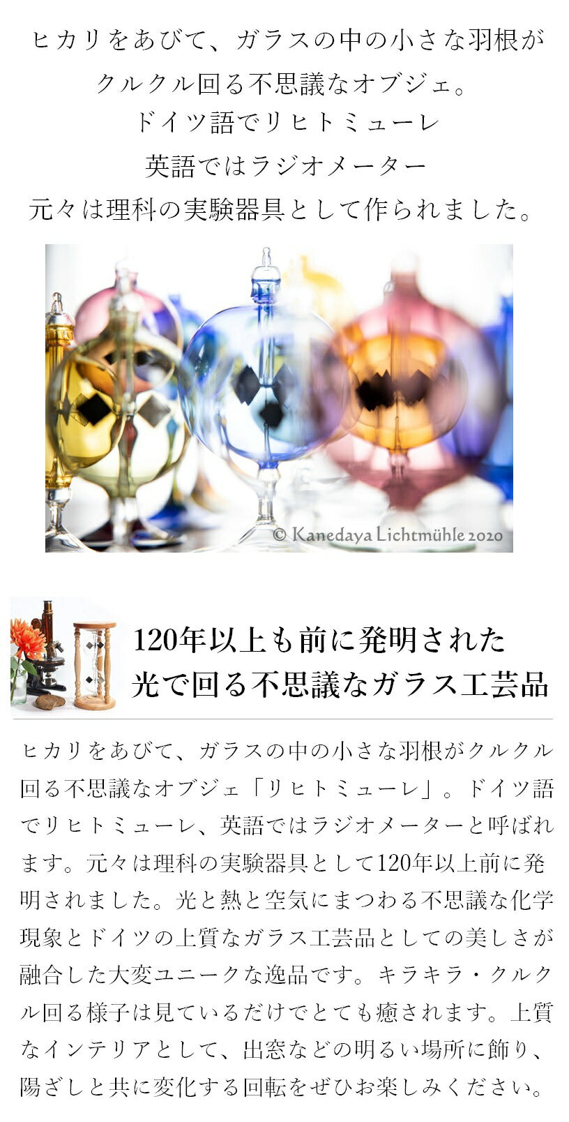 ご覧頂きありがとうございます。当店は日本では珍しいドイツ製リヒトミューレ(ドイツ製ラジオメーター)の専門店として2011年にスタートしました。店内では常時250点以上のリヒトミューレがクルクル回っています。人気テレビ番組「ぶらり途中下車の旅」「じゅん散歩」などでのご紹介をきっかけに知ったという方も多いかと思います。