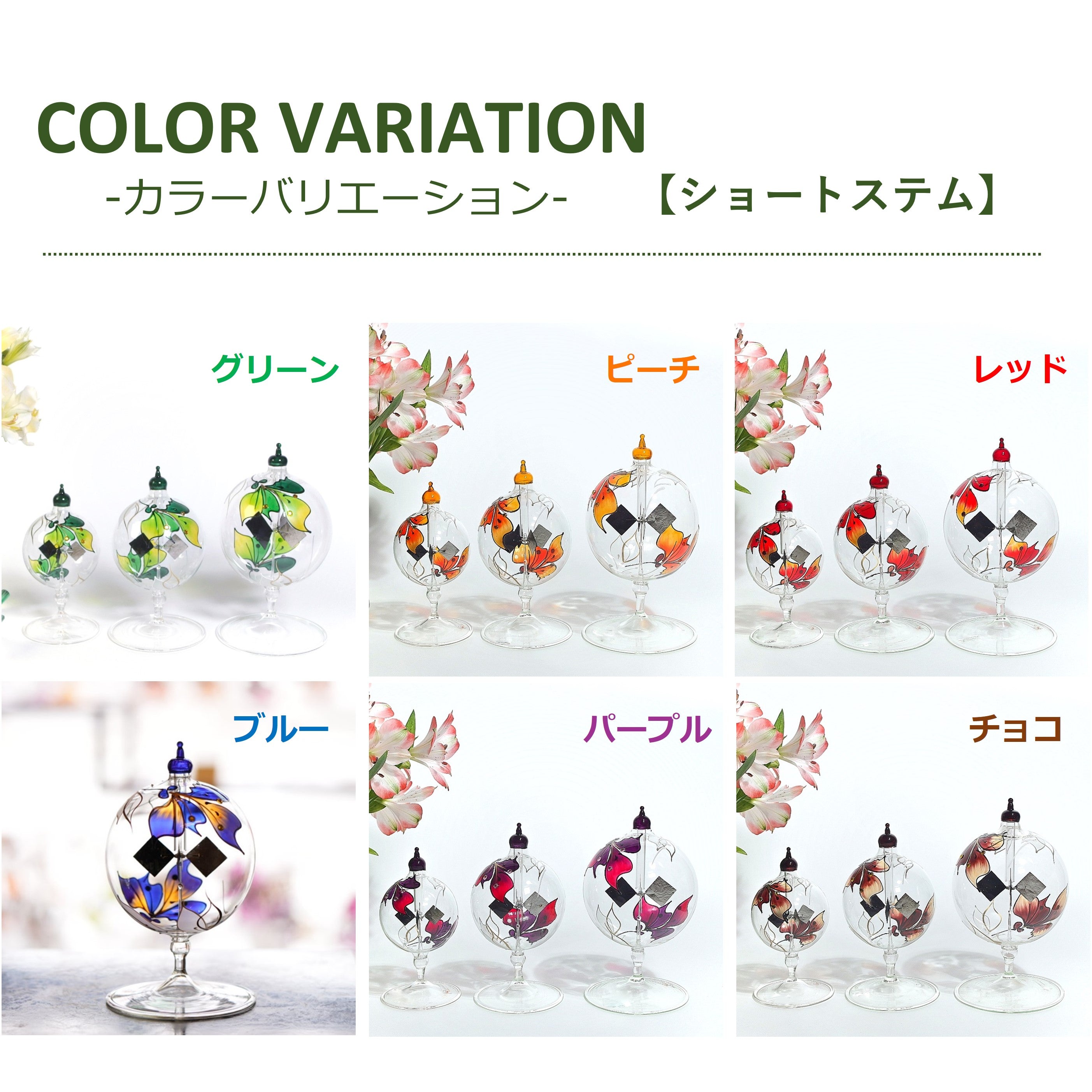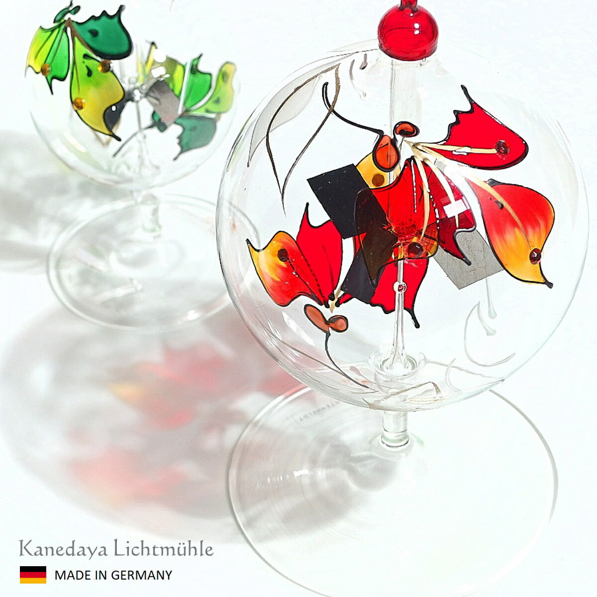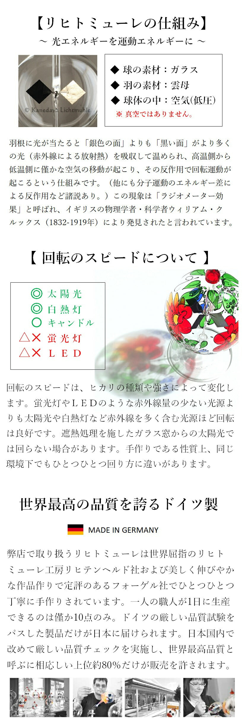 回転のスピードは、ヒカリの種類や強さによって変化します。LED、蛍光灯、遮熱処理が施されたガラス窓からの太陽光では回らないことがあります。手作りであるため、大きさや形、色合い、気泡の入り方、回転の速さなどに個体差があります。作業工程ではガラスに気泡や小さな窯傷やザラつきが入ることがあります。また、羽を黒くするために付けられた煤(すす)が剥がれ落ちたり、塵(ちり)となってガラスの内側に付着することがあります。日常的に高速回転が続く環境下で使用すると回転しなくなることがあります。これらの現象は不良ではなく、製品それぞれの個性や特性としてご理解ください。