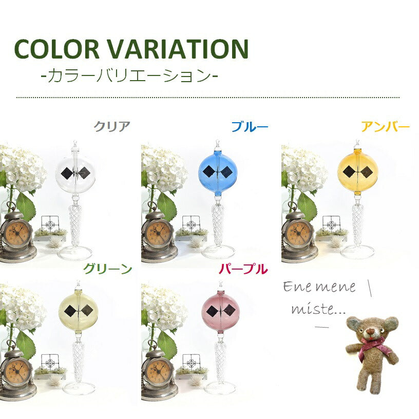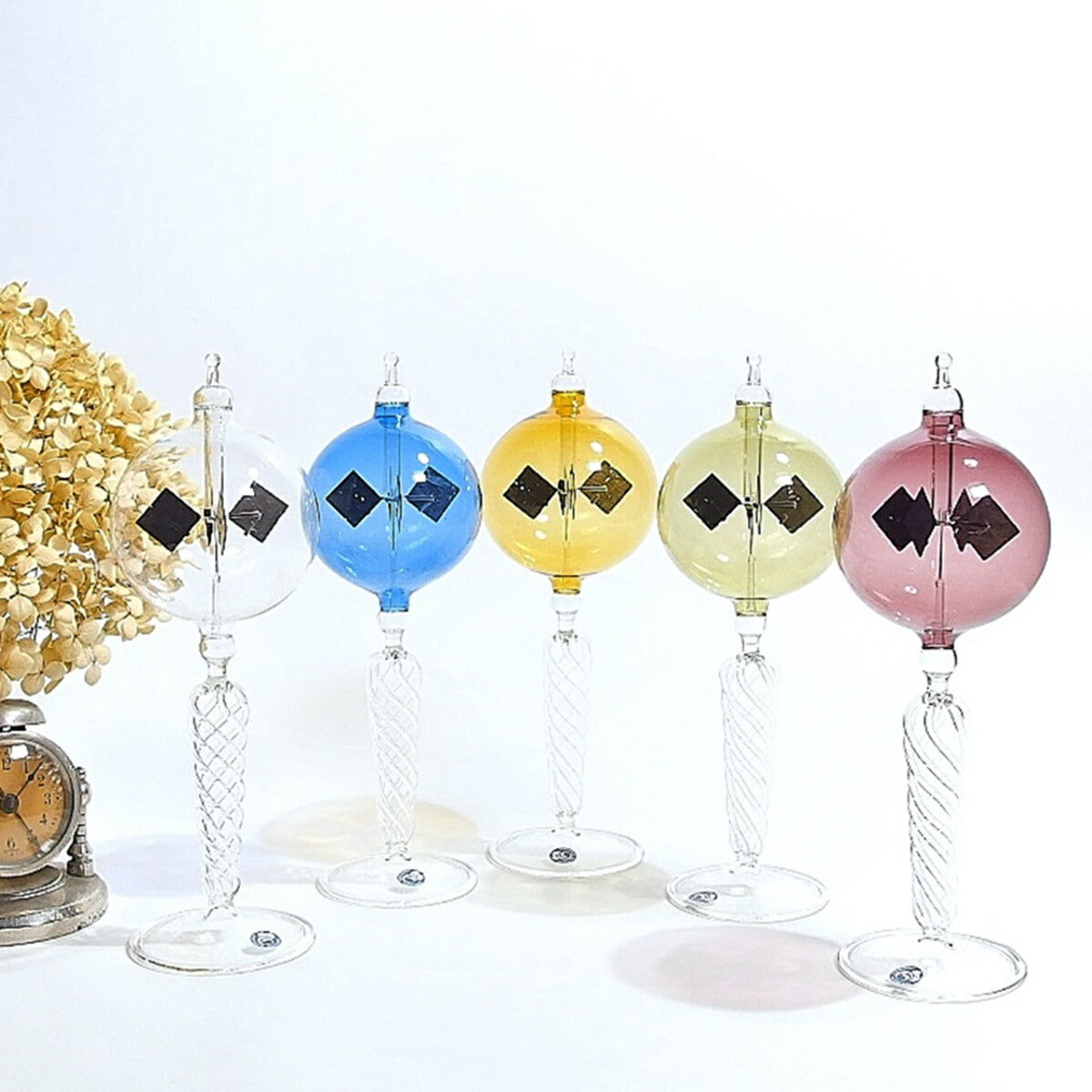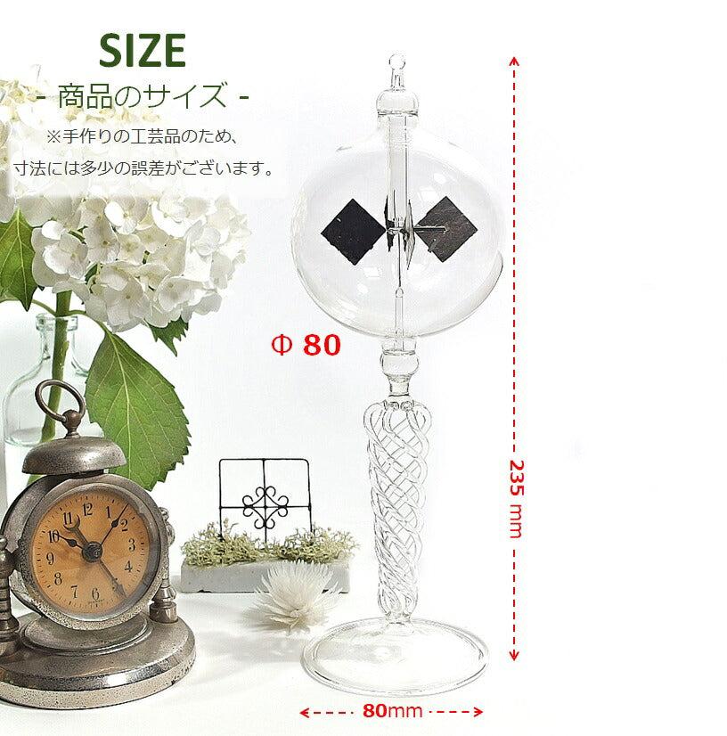 回転のスピードは、ヒカリの種類や強さによって変化します。LED、蛍光灯、遮熱処理が施されたガラス窓からの太陽光では回らないことがあります。手作りであるため、大きさや形、色合い、気泡の入り方、回転の速さなどに個体差があります。作業工程ではガラスに気泡や小さな窯傷やザラつきが入ることがあります。また、羽を黒くするために付けられた煤(すす)が剥がれ落ちたり、塵(ちり)となってガラスの内側に付着することがあります。日常的に高速回転が続く環境下で使用すると回転しなくなることがあります。これらの現象は不良ではなく、製品それぞれの個性や特性としてご理解ください。